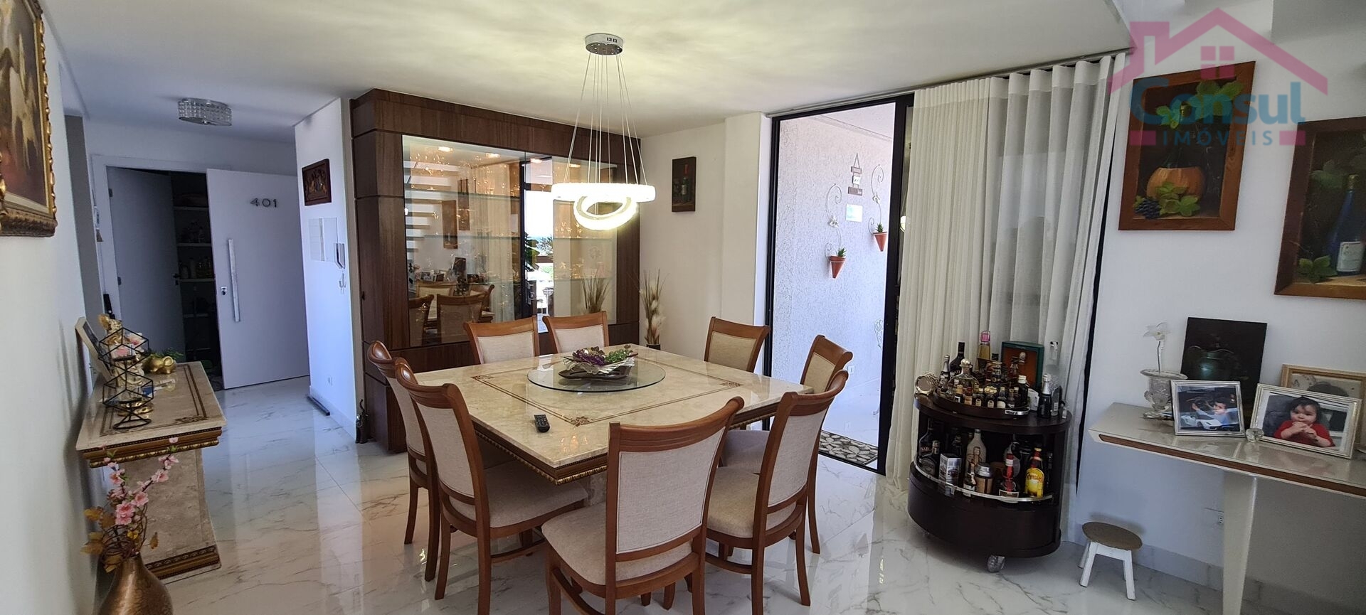 Sala de estar e jantar com dois ambientes e sacada envidraçada com churrasqueira, proporcionando iluminação e ventilação natural. A cozinha possui móveis sob medida com fogão embutido. área de serviço fica localizada no piso superior.