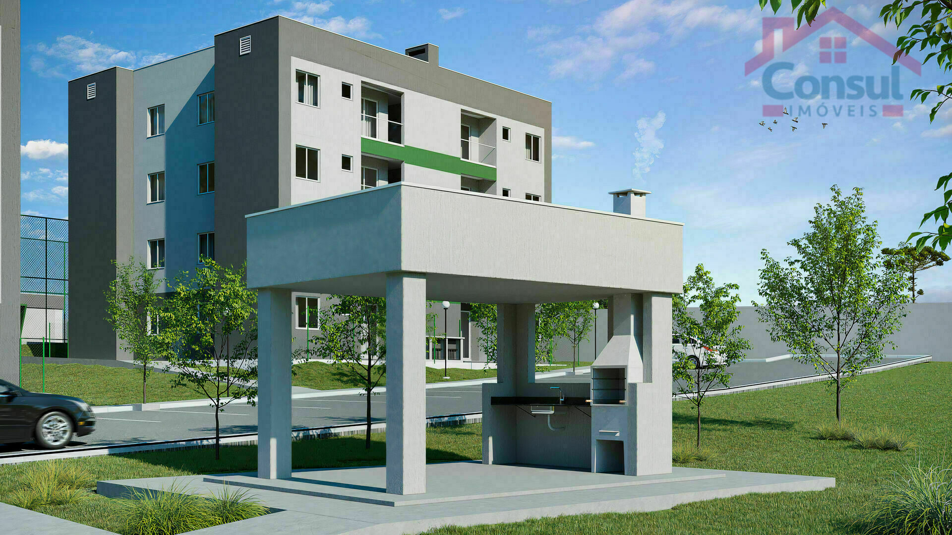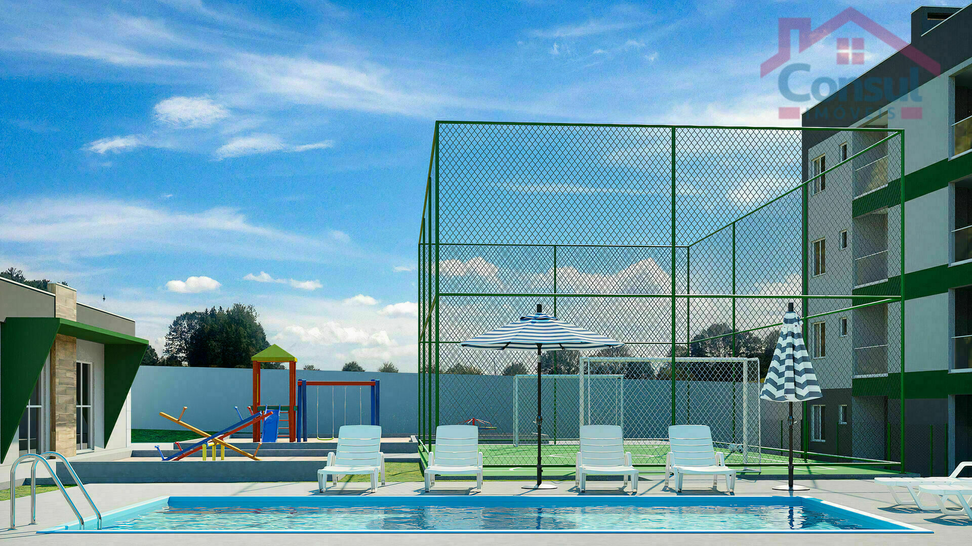 - Itens de lazer: Quiosques com churrasqueira, Salão de Festas, Piscina, Quadra Esportiva, Quadra de Areia e Playground